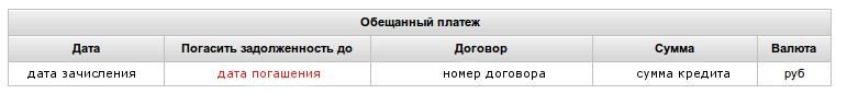 На открывшейся странице появится таблица «Обещанного платежа» (рисунок 3). Выберите договор и внесите сумму платежа в соответствующем разделе. Обратите внимание в таблице на поля со значениями минимального и максимального платежа: